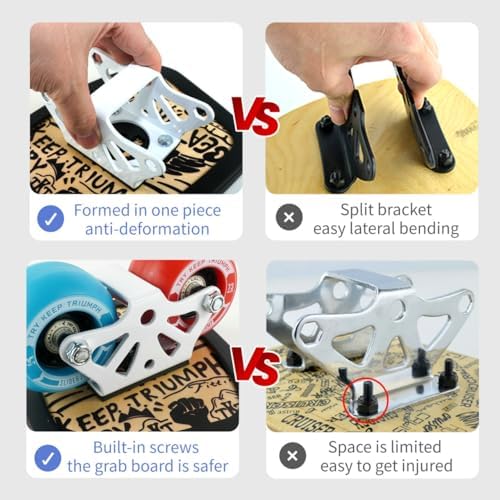 • 【Bracket】The bracket is made of 3MM thick steel plate, which is integrally formed and bent without deformation. The unique inward folding design provides more space for grabbing the board, allowing you to slide more securely. In addition, we also customized a hardened horizontal shaft nut with steps that can be installed inside the bracket and prevent it from loosening easily.