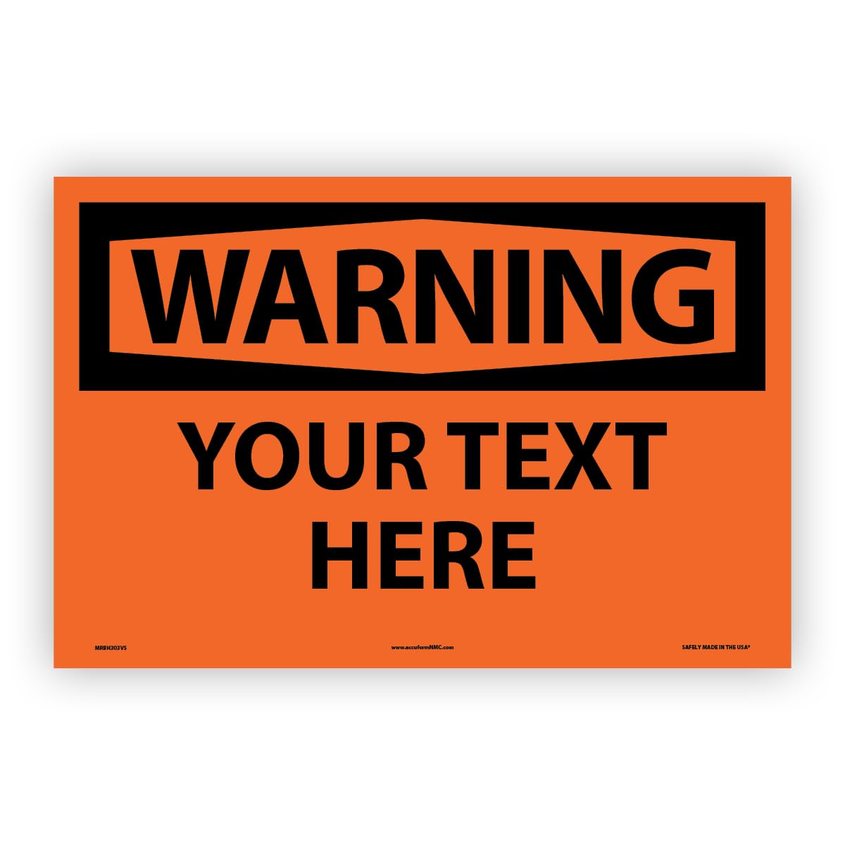 AccuformNMC makes it easy and fun to create your own custom sign. Choose from 8 different sign colors and many different sizes, materials, font colors and font options to create your one-of-a-kind sign. Pick the best material and the most appropriate size to ensure that your message really stands out. Adhesive option is perfect for creating a custom sticker or custom label - it can be placed on almost any flat surface easily with a scored backing for quick peel-and-stick application. Plastic option is the most economical choice for a rigid sign - it is semi-flexible, impact-resistant and durable. Aluminum option is ideal for outdoor settings since it will never rust and can stand up to harsh conditions. Both our plastic and aluminum materials come with rounded corners and pre-drilled mounting holes for easy installation (mounting hardware not included). These signs are treated with AccuformNMC's Sign Muscle protection - a liquid laminate top coat which helps to prevent fading, scratches, and resists chemicals and harsh elements. Post your custom sign inside or outside, at entrances, near machinery, on fences, gates, cabinets, doorways or stairways – wherever the need is greatest. Also excellent for posting information in rental units or in small or family-owned business settings. Once you submit the custom text for your sign, our professional design team will format and fit your personalized message. Please note that offensive or inappropriate messages are not allowed and the order will be cancelled at our sole discretion. AccuformNMC has worked hard for 90+ years to perfect our safety signs, safety tags and safety label manufacturing processes. With our full product line safely made in the USA, AccuformNMC paves the way to a better future in facility safety identification – one innovative product at a time.