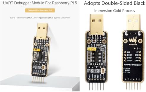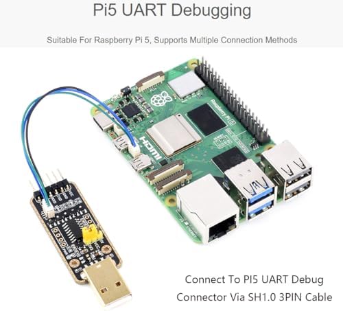 USB To UART Debugger Module for Raspberry Pi 5, Type-A Port, Onboard UART Connector, High Baud Rate Transmission, Multi Connection Methods, Multi System Support Features Support Multiple systems--Supports Mac, Linux, Android, Windows 7/8/8.1/10/11 Supports multiple Connection Methods---Connect to PI5 UART Debug Connector via SH1.0 3PIN cable, Connect onboard 6PIN header to PI5 GPIO UART Interface via 6PIN cable, Connect onboard 6PIN header to PI5 UART Debug Connector via SH1.0 to 3PIN cable Onboard self-recovery fuse and Transient Voltage Suppressor, anti-overcurrent and anti-overvoltage, anti-surge, anti-static, improves shock proof performance, stable and safe communication performance Onboard IO protection circuits, anti-surge, anti-static, stable and safe communication performance Onboard 3.3V and 5V TTL level switch pins for selecting TTL communication level Supports 3.3V/5V output (the module is powered by USB, and the onboard jumper should be shorted to 3.3V or 5V accordingly) Adopts double-sided black immersion gold process, which is durable and has a good look Comes with Tutorial and Online Development Resource: n9.cl/2wwve Specifications HOST INTERFACE--USB DEVICE INTERFACE--UART COMMUNICATION RANGE --50bps ~ 6Mbps USB DEVICE INTERFACE--connector: USB Type-A; protection: self-recovery fuse, ESD protection UART INTERFACE --connector: 6pin right-angle pinheader; 3pin connector; Protection: IO protection diode Package Content Pi UART Debugger x1 6-pin squid cable x1 SH1.0 connector to 3PIN cable ~100mm x1 Dual SH1.0 connector 3PIN cable ~100mm x1