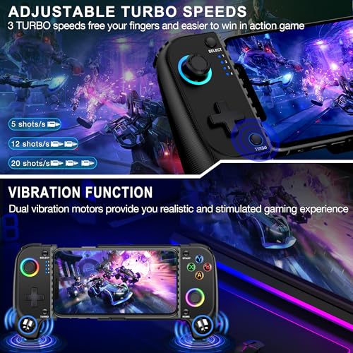 - 【ADJUSTABLE TURBO SPEED & 8H PLAYING TIME】 The iphone controller for gaming has adjustable TURBO function (5/12/20 shots/s), free your fingers and make you easier to win in action game. Dual vibration motors enhance the game immersion, provide you realistic and stimulated gaming experience! Built-in rechargeable 600mAh high capacity battery provides over 8 hours game playing, and it can be fully charged within 2-3 hours. Never worry about game interruptions, enjoy your gaming time