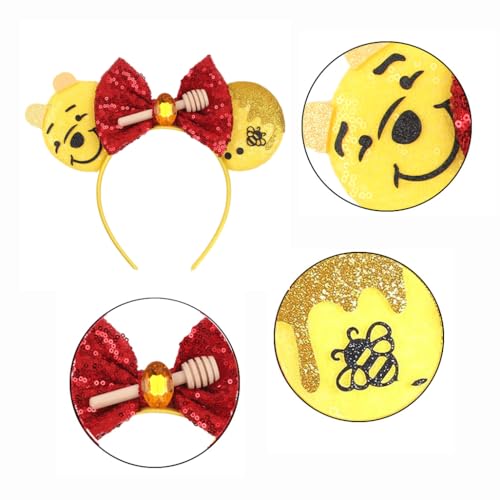 - Bee Mouse Ear Headband: This bee head band is super cute and full of sparkle! The headband consist of red bow, yellower sequin ears and hoop, wooden honey dipper. Accent with honey and buzzing bees on each ears. Full of three-dimensional feeling, ears stand up well and not easy to slip.