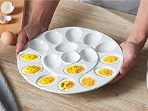 - Elevate your next gathering with our beautifully crafted Ceramic Deviled Egg Platter, designed to impress your guests and make entertaining easy. This deviled egg tray for parties holds up to 17 eggs securely in its molded indentations, making it the perfect egg holder for serving deviled eggs, appetizers, and hors d’oeuvres. Whether it’s a family brunch, a festive holiday, or a casual get-together, this egg dish is an elegant yet practical addition to your table setting. Made from high-quality, lead-free ceramic, this egg plate offers both durability and style. The classic white finish of the ceramic egg platter complements any décor, adding a touch of sophistication to your spread. Not only is it visually appealing, but the sturdy ceramic material ensures that your platter will last for years to come. Resistant to scratches and chips, this ceramic egg tray can be used time and time again, whether for special occasions or everyday use. This deviled egg tray is more than just a serving dish—it’s a must-have kitchen essential that simplifies food preparation and presentation. Its 17 indentations are thoughtfully designed to keep eggs or other bite-sized appetizers neatly in place, so your food stays perfectly arranged without slipping or sliding around. And when the party’s over, cleanup is a breeze. The ceramic egg holder is dishwasher-safe, so you can spend more time enjoying your guests and less time scrubbing dishes. It’s also microwave-safe, allowing for quick reheating of any leftovers. Versatility is another key feature of this egg platter. While it’s perfect for serving deviled eggs, it’s equally suited for presenting mini desserts, appetizers, or even sushi rolls. Its simple yet elegant design makes it a multifunctional dish that you’ll reach for again and again. Use it for holidays like Easter or Christmas, at baby showers, birthday parties, or even for casual dinners at home. The possibilities are endless with this ceramic egg tray. Whether you're a seasoned host or just looking to add a touch of sophistication to your next event, this deviled egg platter is the perfect solution. Its timeless design, combined with its practical features, ensures that it will be a centerpiece at any gathering. Treat yourself or gift it to someone who loves entertaining—either way, this deviled egg tray for parties is sure to impress.
