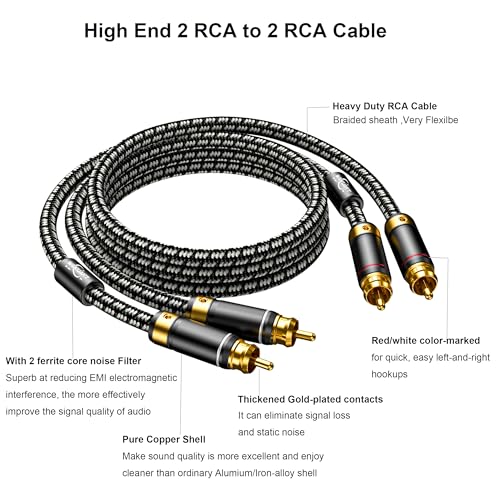 - Heavy Duty AWG20 Copper conductors and Ultra thick Gold-plated RCA PURE COPPER connectors, it could eliminate signal loss and static noise, provide durability and improve the signal transmission, and the copper shell blocks any interference which prevents the loss of sound quality