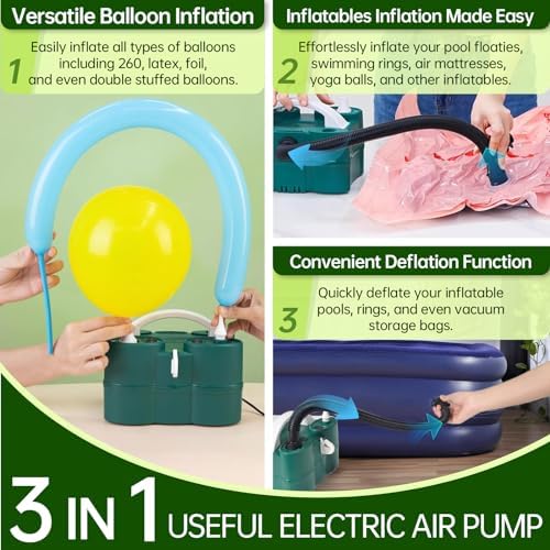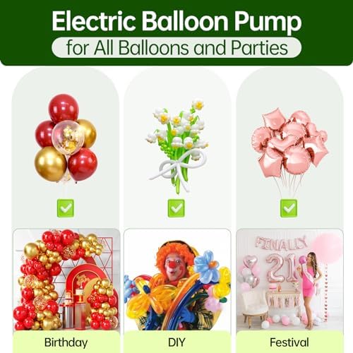 - 【3-IN-1 Balloon Pump Electric】- This electric balloon inflator is a must-have for any decorating party! When you receive this green electric balloon pump, you will also receive for balloon tying kit x1, balloon cutting x1, nozzles for small balloons x2, nozzles for balloons x2, nozzles inflation x3, extension hose with 2 nozzles x1, user manual x1.