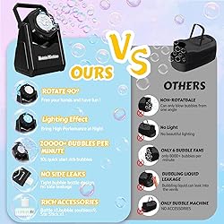 20000+ Bubbles Filling the Air and Creating a Fun and Festive Atmosphere.15 bubble wands and powerful wind designed as more bubble hole and faster speed can produce more bubbles, improving satisfying experience.This bubble machina is handy and convenient, making it a popular choice of bubble machine for partiesfor those who want to create a fun and bubbly atmosphere without much effort. Lights Effect and Adjustable the launch angle by 90° Bring Extra Level of Excitement. The bubble machine not only kids outdoor toys but also serves as a great distraction for children during medical procedures, providing entertainment for hours. It helps to alleviate their fear and anxiety, making the experience less stressful for both the children and their parents. (4AAbatteries-not included) Upgraded Bubble Maker with No Leakage Design Sufficient for Prolonged Use. Fully enclosed design whitout leakage problem, it won't stain your hands and mess everywhere. With 200ml high-capacity liquid tank for 30mins continuous use, enjoy uninterrupted bubbles fun! Also Comes with 9 packs bubble water for bubble refill. Durability and Ease Of Use: Our bubble blower is easy for even toddlers to hold, reducing the effort required to blow bubbles and making it easy to load the bubble water. This ease of use makes the product more enjoyable for all ages. Popular Party Favor for Kids and Providing Entertainment for Hours. Bubble machine for kids is a hit at children's birthday parties, is a fun outdoor toy and engaging activity for kids, keeps children busy and is fun to play with, making bubble maker a ideal gift for children, grandchildren, and pre-kindergarten students on summer Birthday, yard and park bubble-chasing fun more enjoyable, and it's also a special treat for parade attendees such as Independence Day National Day Thanksgiving Halloween Christmas Battery Operated Note: Please use a stronger batteries to operate. If your batteries are on the weaker side, it will appear to function but won't actually blow bubbles. Rather, it'll just make soap suds. Replacing with stronger batteries was all it took for amazingness bubble fun to happen!
