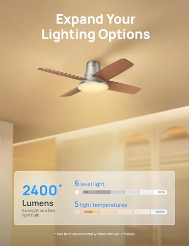 • Multiple Light Options: The modern ceiling fan with lights offers infinitely adjustable brightness and color temperature, producing up to 2400 lumens with light tones that range from 2700K warm white to 6500K cool white.