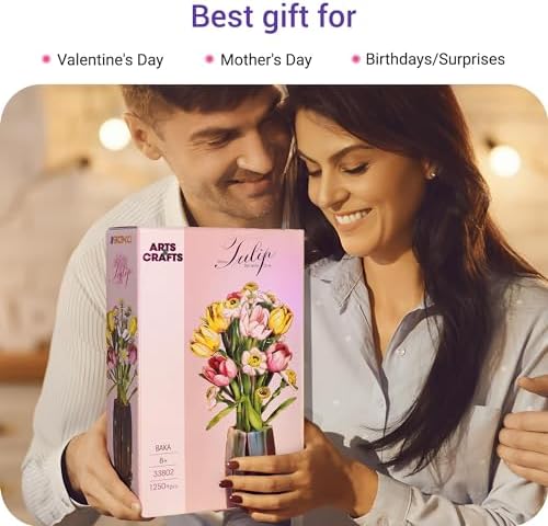 - COMPLETE SET: Contains 1250 pieces to build beautiful artificial flower arrangements including tulips and daisies, plus a decorative vase for display