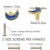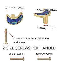 - Product Name: Moon knobs Material: Made of high quality zinc alloy. Color: Watercolor shell Packaging 6 x Moon knobs equipped with two different lengths of screws. Precautions 1.Manual measurement, please allow slight errors on size. 2.The actual color of the item might be slightly different from the pictures due to the camera and light effect.