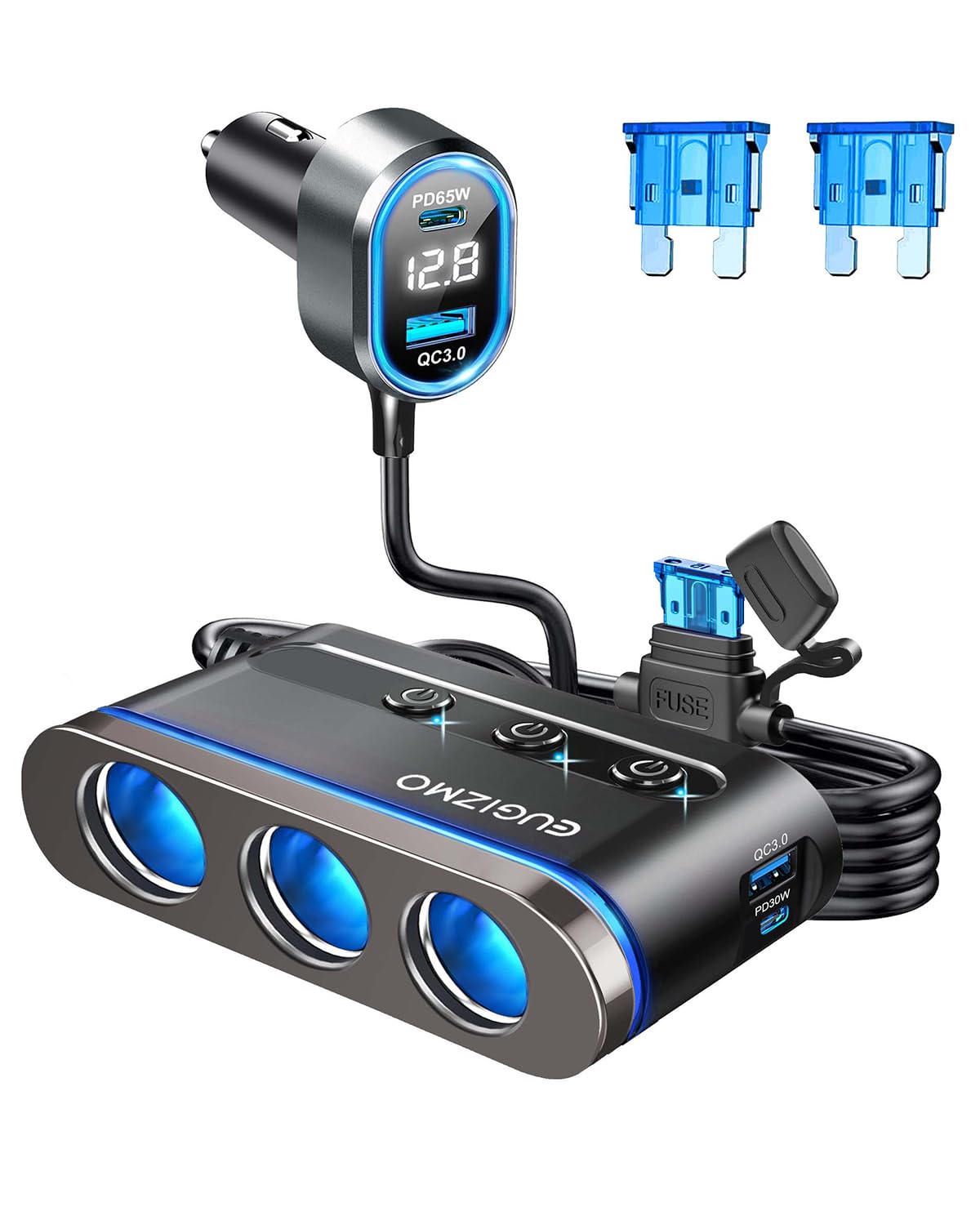 - LED Voltage Display: The cigarette lighter splitter's real-time LED voltmeter display aids in keeping track of the battery voltage in your automobile. Protect against over-voltage, over-loading, over-heating, short-circuiting, over-current, and over-charging. Specifically marketed road trip essentials, and offers the highest power output to keep your entire family's devices charged during long journeys.