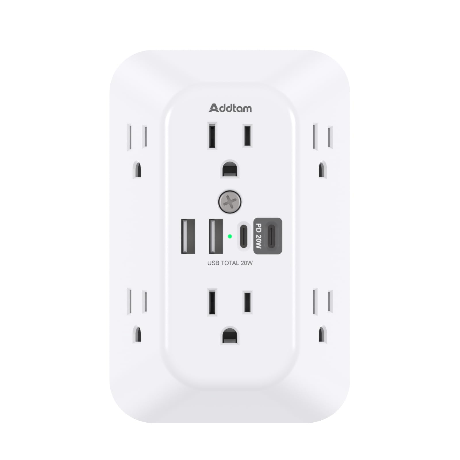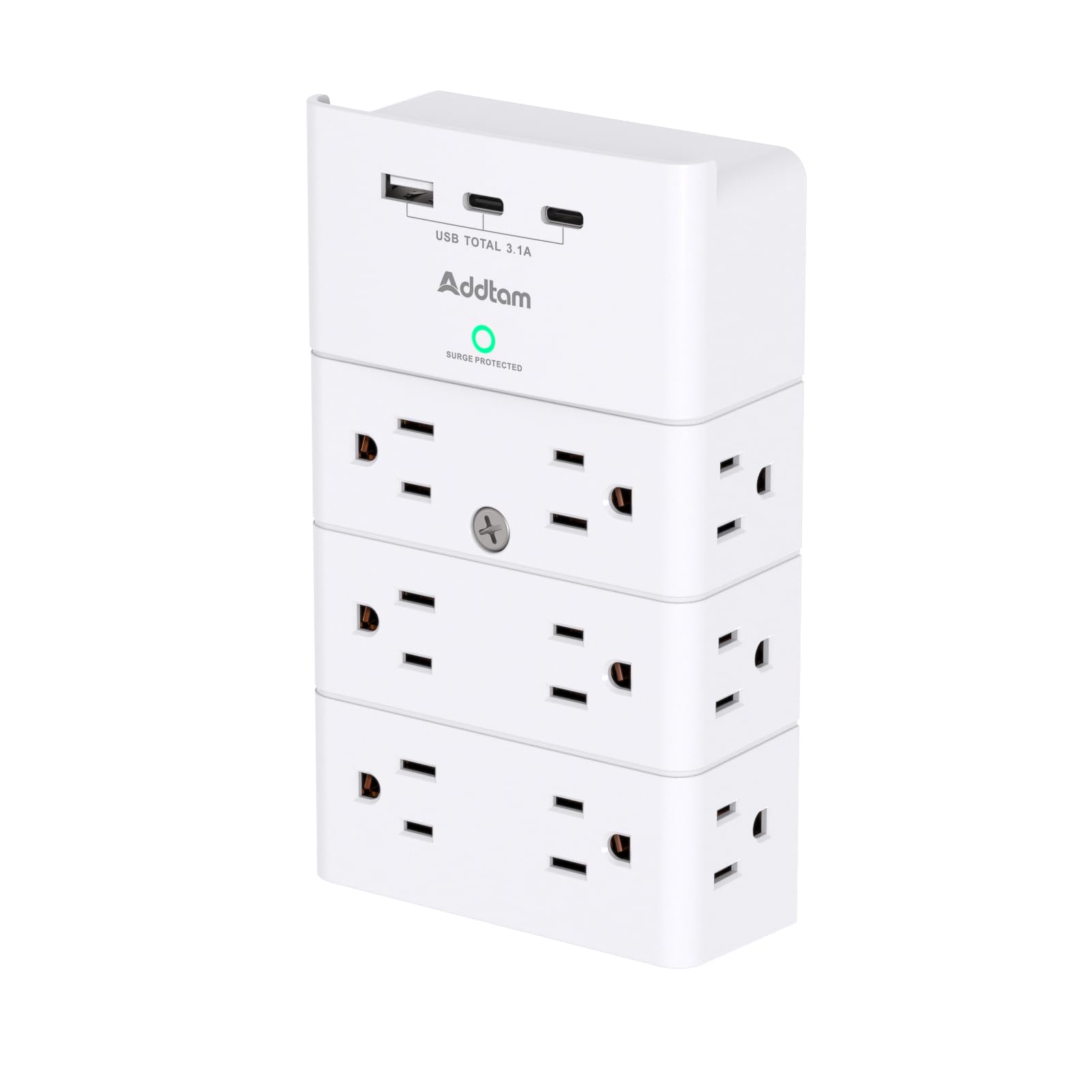 - 【7 IN 1 USB Wall Outlet Extender】- 4 AC outlet adapter (3 side, 15A/125V/1875W) with built-in 1080 Joules surge protector and 3 USB charging ports (2 USB C, total output DC 5V/3.1A). Widely space design can fit 7 plugs at the same time without blocking, make your bedside table and desktop organized.