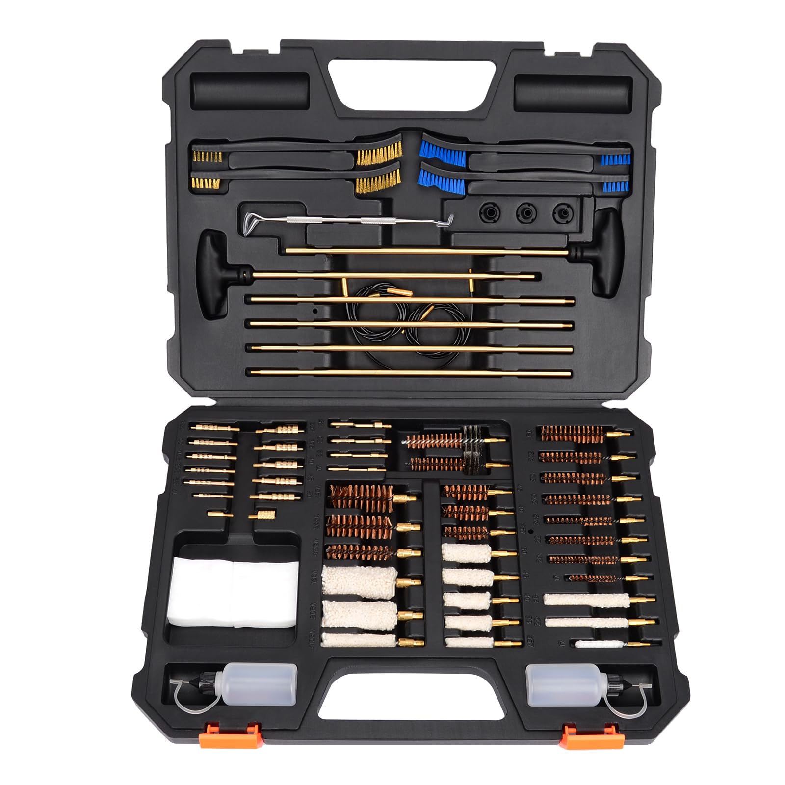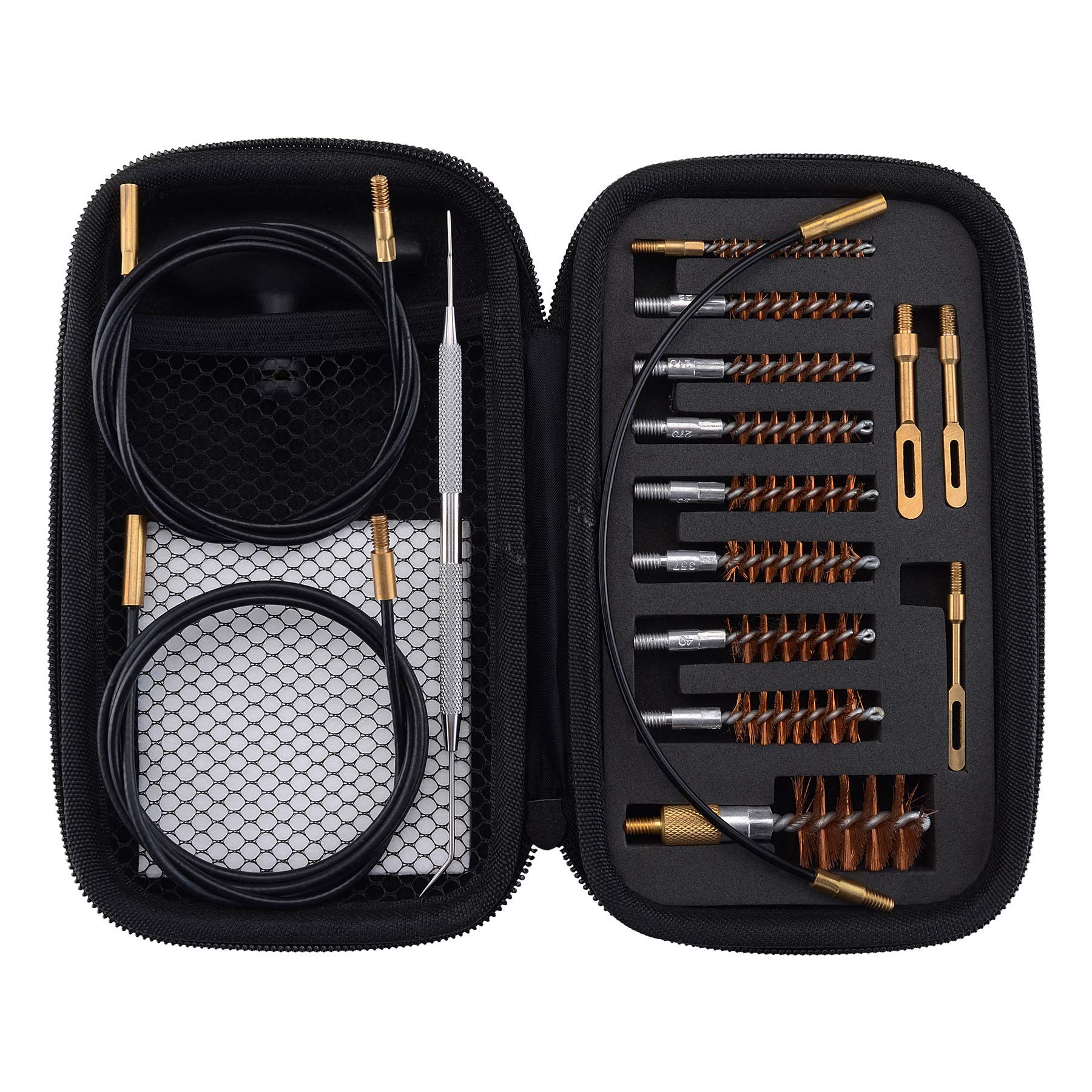 Whether you’re packing a 1911, striker-fire, or revolver, this is the right cleaning kit for you. It’s tough. It’s organized. It’s thorough. It’s just like you. Product Feature: This organized gun cleaning pouch case doesn’t take up much space. Throw it in your range bag or hang it at your workbench. Tools are clearly labeled and snap securely into place keeping things organized. The brass rods have connection points and screw together to form a strong and stable 10.5 inch gun cleaning rod.This sturdy connection point enables you to brush, pick, and scrape your handgun The Stainless steel pick is great tool to remove the harmful materials from your gun. To keep your firearms performing at their best. The brushes are standard twisted steel core with bronze bristles. Sturdy materials: The cleaning rod, jag and slotted tips are made of brass which are guaranteed a life time. Package Includes: 1*Handle 1*Zippered Tool Case 10.5" Brass Gun Cleaning Rod (2 Segments) .45 Cal. Brush and Jag .40 Cal. Brush and Jag .357 Cal./.38 Cal./9MM Brush and Jag .22 Caliber Brush and Jag Large Brass Slotted Tip Small Brass Slotted Tip 100*Gun Cleaning Patches 1* Stainless Steel Pick 1*Nylon Brush Note:.357 .380 and 9mm are essentially the same sizeFor the product transportation safety, this gun cleaning kit does not have any solvent or oil