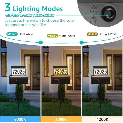 - 3 Colors in 1 Mailbox Number Sign: The solar address sign for mailbox combines three lighting modes - Mode 1: Cool White 6000K(ON), Mode 2: Warm White 3000K, Mode 3: Daylight White 4200K in one light. Just press the switch button beneath the solar panel to set a favorite lighting color. Kindly remember to switch ON the device to choose the color mode before the FIRST charging