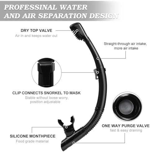 - SAFE DRY TOP SNORKEL - The new dry snorkel uses an automatic closing valve at the opening to prevent water from entering. When the snorkel is submerged below the waterline, the top float valve will close automatically due to buoyancy, water will not flow in, so you will not be choked by water. It reopens when the snorkel reaches the water's surface due to gravity.