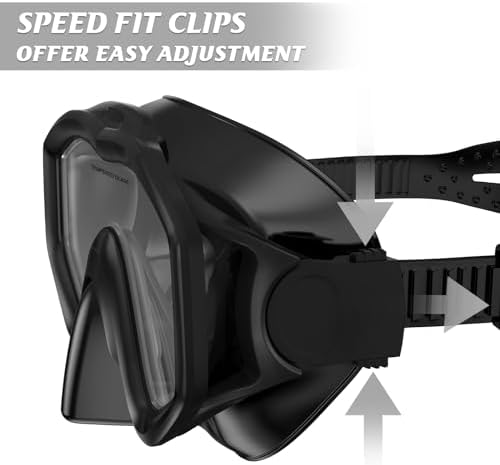 - ADJUSTABLE SNORKEL MASK - No need to worry about water leakage. Taking a deep breath will exhaust air to make the mask fit more closely to the face, and then adjust the skirt to achieve perfect sealing. This snorkel mask adult fits both adults and teenagers. This mask has a very soft liquid silicone skirt, a food-grade material that flexibly fits faces of different sizes and ensures waterproof sealing.
