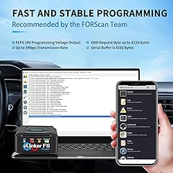 [Pro Bluetooth OBD2 Scanner]: vLinker FS BT is a Wireless Bluetooth (BT3.0+BLE4.0) dual-mode OBDII adapter, diagnostic scan tool, trip computer, logger, and real-time performance monitor capable of accessing manufacturer - specific vehicle data. Specifically for coding and programming APP that requires large amount of data transmission. Transforming your iOS (BT+BLE), Android device, or Windows PC into a professional diagnostic scan tool. Read and clear your car’s trouble codes, live data and check engine light is a piece of cake. [Fast and Stable Configuration & Programming]: Support FEPS 18V programming voltage output in FORScan. Reaching the Highest 3Mpbs Baud Rate and OBD Request Bytes Up to 4K Bytes. Let you enjoy smoother graphics, save & share reports, programming & configuration faster and meet the needs of some special long frame communication. [Wide Compatibility]: Support HS-CAN and MS-CAN Protocols,can access these proprietary For-d car networks in addition to the 5 standard OBD-II protocols. Not only can it be used safely on 12V automotive systems, but 24V system. [Bi-directional Control, Quickly Locate Problems]: The bi-directional scan tool enables you to send commands from your smartphone directly to the vehicle's ECU for active testing. This feature helps to quickly narrow down problem areas, reducing the mechanic's diagnostic time and can help DIY users locate faults more easily. [Battery Saver and Protection Technology]: Auto sleep and wake up mode ,over-voltage, over-current, over-temperature and battery drain protection allow vLinker FS Bluetooth to be left plugged in without damaging the car and battery. Operating Current is 51mA, automatic sleep in idle state, sleep current is as low as 3mA. [Support 3rd-Party OBD2 Apps (NOT Included)]: FORScan, TuneECU, OBD JScan, BimmerCode, BimmerLink, Tes.Lax, etc. Made for FORScan, recommended by FORScan Team. (Note: Apps Don't Include: Our products don't include any Apps and requires separate download or purchase from Play Store or App Store. Apps are categorized into free and paid ones. Consumers can select them on your needs.) [Portable, Useful & Economical]: Dealed for DIY repairs, travellers, family mechanics, repair stores, professionals who work with a wide range of vehicles and do some repairs and maintenance. Easy and fast to use. vLinker FS bluetooth diagnostics scanner tool is ready to use when it via your phone bluetooth to connect the App. Makes your smartphone or tablet into a pro diagnosis scanner. vLinker FS BT + APP can work now. [Coding Made Easy]: Experiment with customizations tailored to fit your driving preferences and style. vLinker FS Blutooth is so fast, stable, and easy to use that you can change settings and revert back to factory settings in minutes if you don’t like them. Find out what works for you and create the ultimate driving experience. Unlock more advanced and hidden functions.