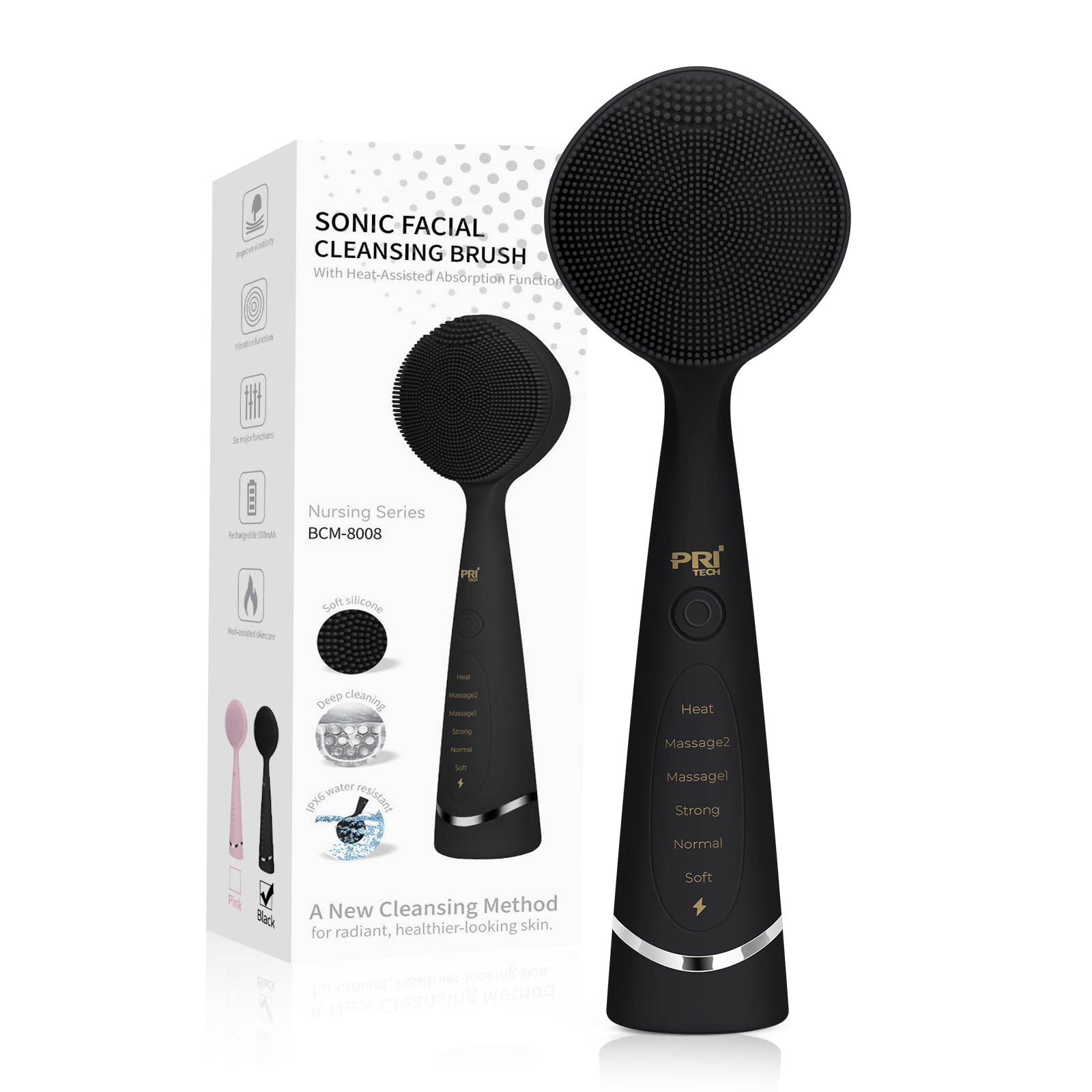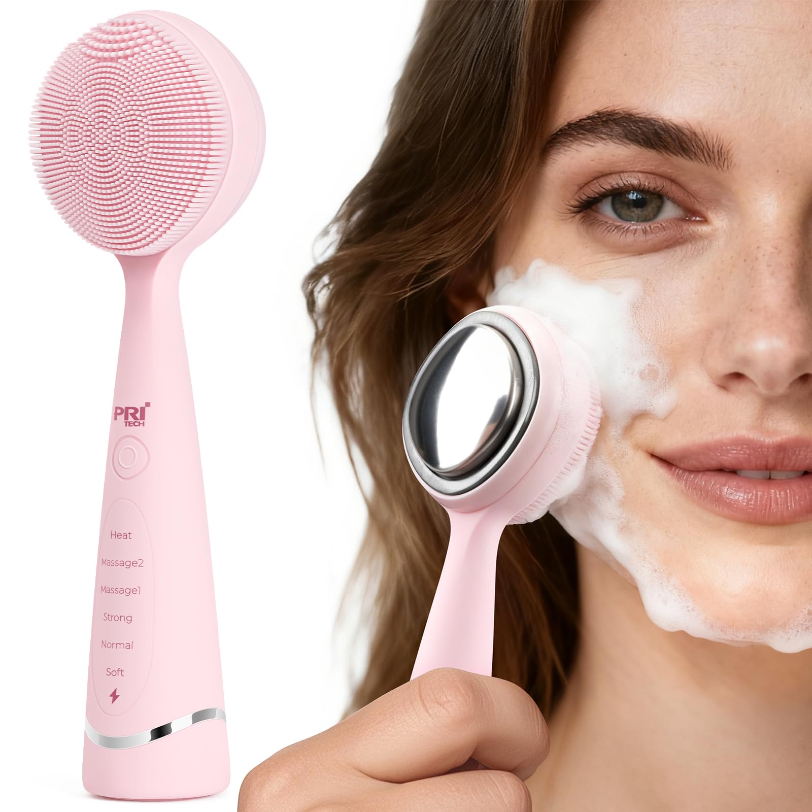 PRITECH Facial Cleansing Brush, Rechargeable Silicone Face Scrubber with Heat Massage End, Vibrating Exfoliator Scrubber for Deep Cleaning, Waterproof Face Brush for Women and Men (Pink)