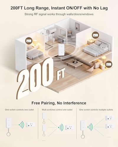 - 200 FT Longer Remote Range - Strong RF signal of this remote light switch can work through walls, doors, and windows, giving you the freedom to place the switch wherever it's most convenient for you. lag-free response when turning devices on/off from across the room.
