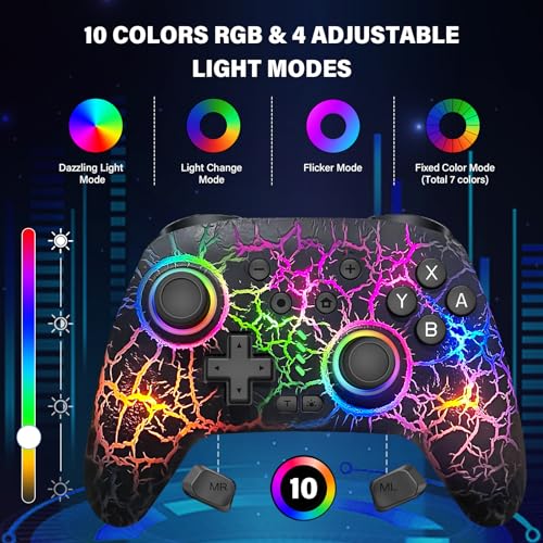 - 10 COLORS LIGHT & 4 LED MODES: This switch 2 controller with cool colorful light. Pro switch controllers has 4 different LED modes: Dazzling Light Mode, Light Changing Mode, Flicker Mode and 7 Fixed Color Mode(red, orange, yellow, green, cyan, blue, purple). Wireless controller has 4 levels of light brightness: 40%-60%-80%-100. With this switch pro controller, allow you switch the color models according to different games to immerse yourself deeply in your games