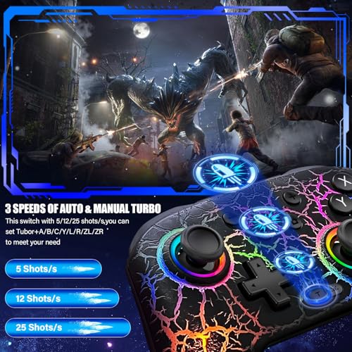 - SPEEDES TURBO BURST FUNCTION: This switch controller pro support that you could set auto or manual turbo mode. Wireless controller has 3 burst speed: 5 shots/s, 12 shots/s or 25 shots/s. This pro controller switch 2 make the game operation more smooth. You also can customize the TURBO button, A/B/X/Y/L/ZL/R/ZR all buttons can be set to TURBO, which make it easier to win an arcade or action game