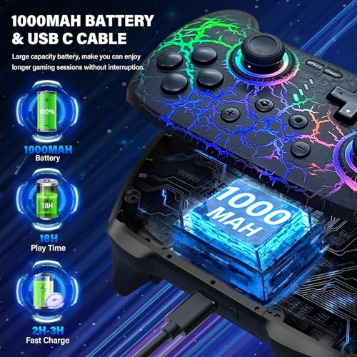 - 1000mAh HIGH CAPACITY BATTERY & 18H GAMING TIME: Pro controller switch for switch 2 built-in 1000mAh battery which provide more than 18 hours playing time on LED light mode. This switch controller can be fully charged within 2-3 hours. Battery lasts really well and charges quickly with a USB Type-C cable. With this wireless switch controllers, you can enjoy playing game longer without interruption. It will be the best parner for your gaming