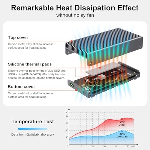 Qwiizlab Fanless 40Gbps USB4 Thunderbolt External SSD Enclosure with Aluminum Heat Sink Chasiss, Supports M.2 NVMe PCIe SSD up to 8TB (SSD Not Included)