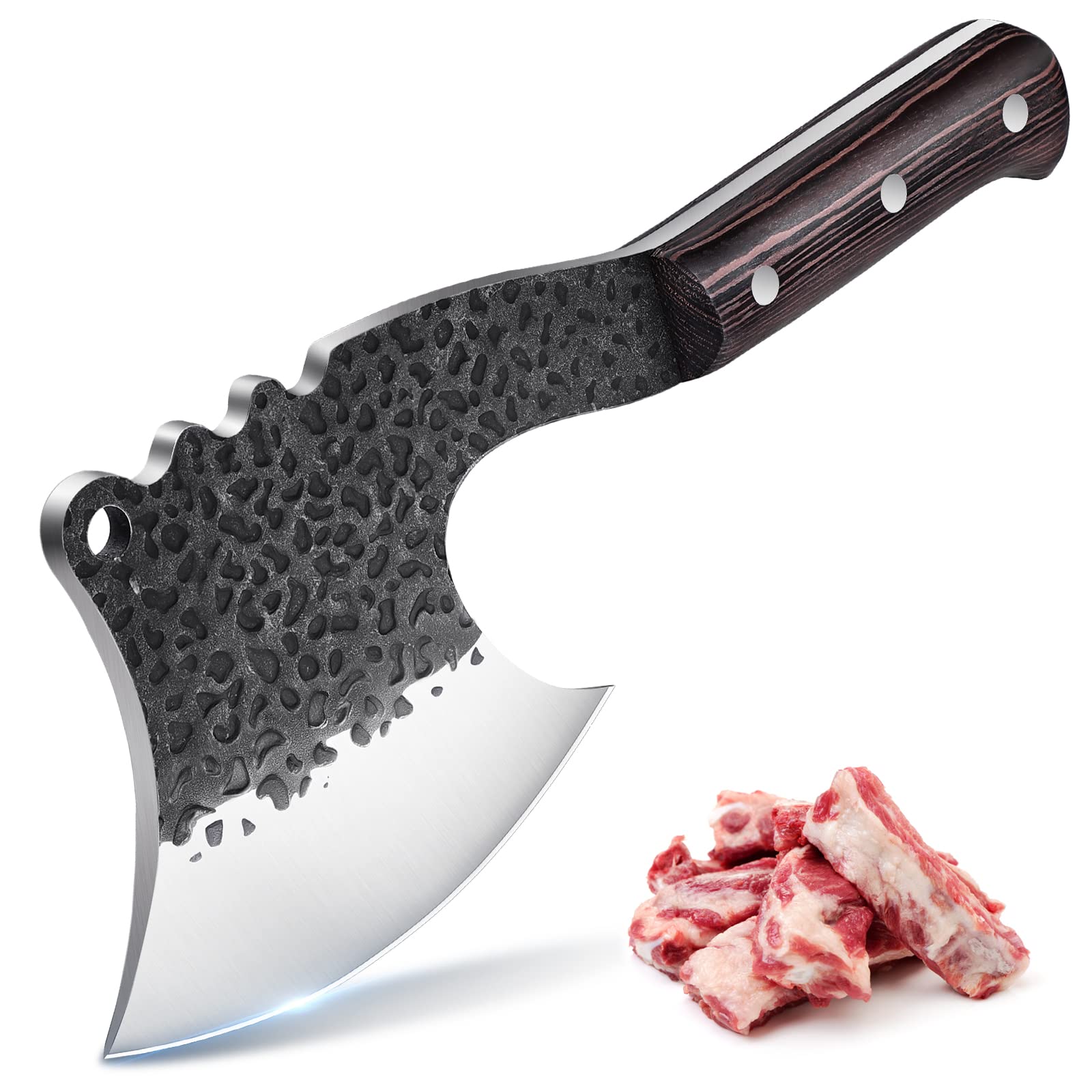 - ULTRA SHARP BLADE - The 16° V-shaped meat cleaver blade edge minimizes cutting resistance, helps you cut food effortlessly like chopping through butter. You can hang the vegetable cleaver on the wall with the hanging holes on the blade top and handle. The slippy unique hammered texture on the blade makes it pretty and anti-sticking, easy to clean and maintain.