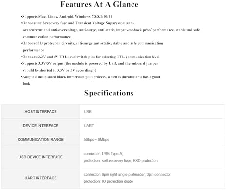 - Onboard IO protection circuits, anti-surge, anti-static, stable and safe communication performance. Onboard 3.3V and 5V TTL level switch pins for selecting TTL communication level.