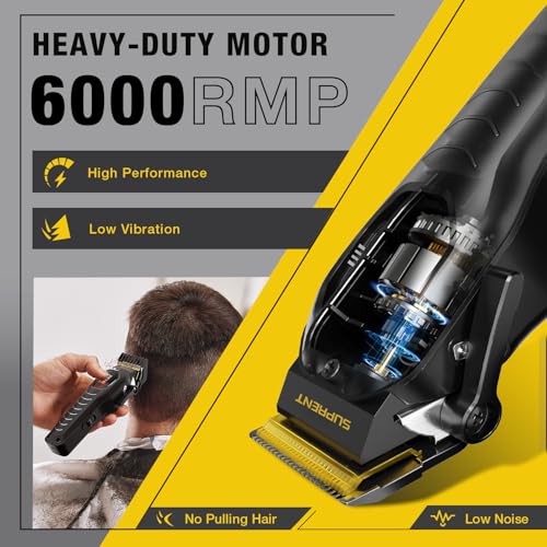 - High-Performance Motor & Self-Sharpening Titanium Blades: The SUPRENT clippers can tackle thick hair with ease using the heavy-duty 6000rpm motor. This hair cutting kit is designed for efficient and precise cutting. And this cordless hair clipper features a titanium blade that ensures clean, precise cuts every time. Enjoy easy, efficient haircuts and achieve a salon-quality finish.