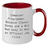 - Calling out all the sassy, classy, and certainly a bit bad assy Computer Programmers! Do you often find yourself baffled by the lack of an official job title that truly captures your unique blend of expertise and attitude? Well, fret no more, because we've got just the thing to help you flaunt your programming prowess with a touch of sass - our Computer Programmer Two Tone Coffee Mug. Crafted from sturdy ceramic, this mug boasts an 11oz capacity, making it the perfect companion for your morning caffeine fix or those late-night coding marathons. Its two-tone design, available in four striking color combinations - Black and White, Red and White, Navy and White, and Pink and White - adds a touch of flair to your desk setup. Whether you're sipping your favorite brew or simply displaying it as a statement piece, this mug is sure to turn heads. But what truly sets this mug apart is the witty quote emblazoned on its surface: 'Computer Programmer. Because Classy Sassy And A Bit Bad Assy Is Not An Official Job Title.' It's a tongue-in-cheek nod to the unique blend of skills and personality traits that define Computer Programmers everywhere. Whether you're buying it for yourself or as a thoughtful gift for a fellow programmer, this mug is guaranteed to bring a smile to their face and celebrate the awesomeness that is Computer Programming. So, if you're a Computer Programmer who takes pride in your classy, sassy, and slightly bad assy nature, don't miss out on this opportunity to add a touch of humor and personality to your daily routine. Order your Computer Programmer Two Tone Coffee Mug today and let the world know that you're not just a coder - you're a coding rockstar!