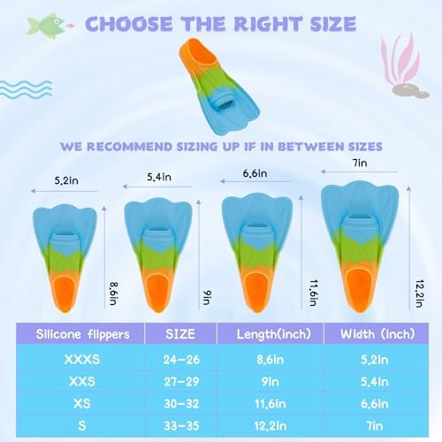 - [Flippers Size] Please see size chart on left to find the correct fin size,if you are in between sizes,users with a wider foot should size up,otherwise we recommend sizing down for a tighter fit.