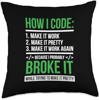 - The design reads "How I Code 1. Make It Work 2. Make It Pretty 3. Make It Work Again Because I Probably Broke It While Trying To Make It Pretty". This design makes a great gift for birthdays or Christmas.