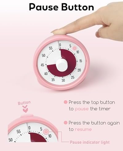 Visual Timer for Kids with Pause Button, 60-Minute Countdown Timer with Silent Operation, Desk Pomodoro Timer Kid Time Management Tools for Classroom, Office and Kitchen, Pink
