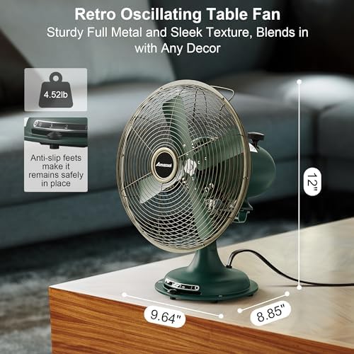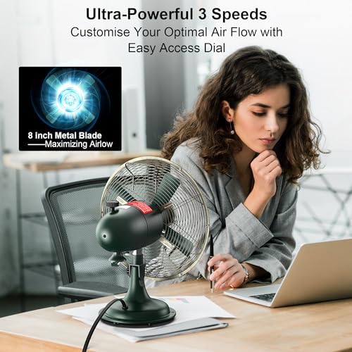 AMACOOL Oscillating Vintage Fan, All Metal 8" Retro Table Top Fan, Adjustable Head Tilt, Quiet 3 Speeds Plug-In Desk Fan for Bedroom Home Office & Kitchen