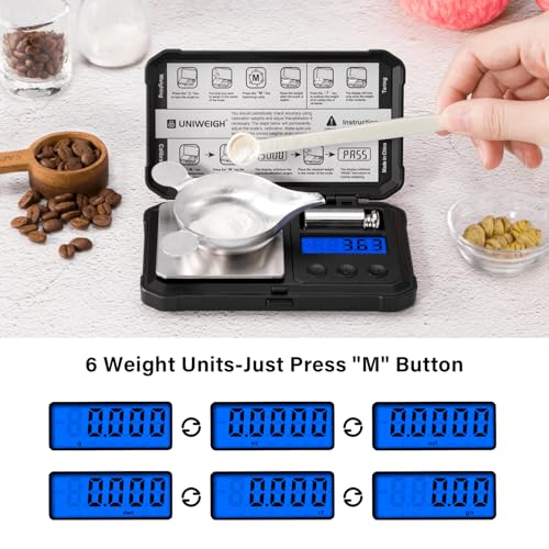 - Portable Scale & Flip Cover: UNIWEIGH mini digital pocket scale is compact and lightweight, only the size of a cell phone, easy to carry around. The high quality ABS flip cover design protects the scale pan and measurement sensor from bumps and friction.