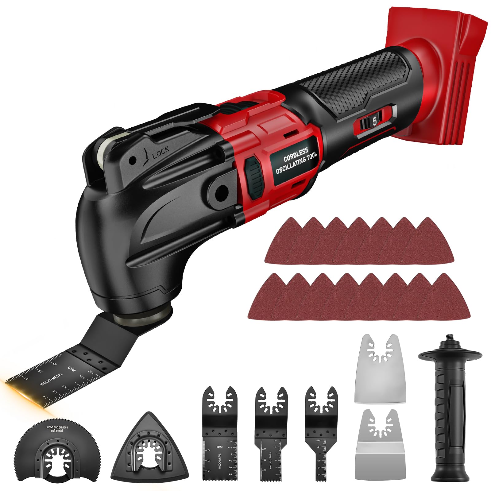 Cordless Oscillating Tool, Brushless Orbiting Tool Compatible with De-Walt 20V Battery, 23 PCS Multi-Tool Kit with Auxiliary Handle for Cutting, Scraping, Sanding, 6 Variable Speed (Tools Only)