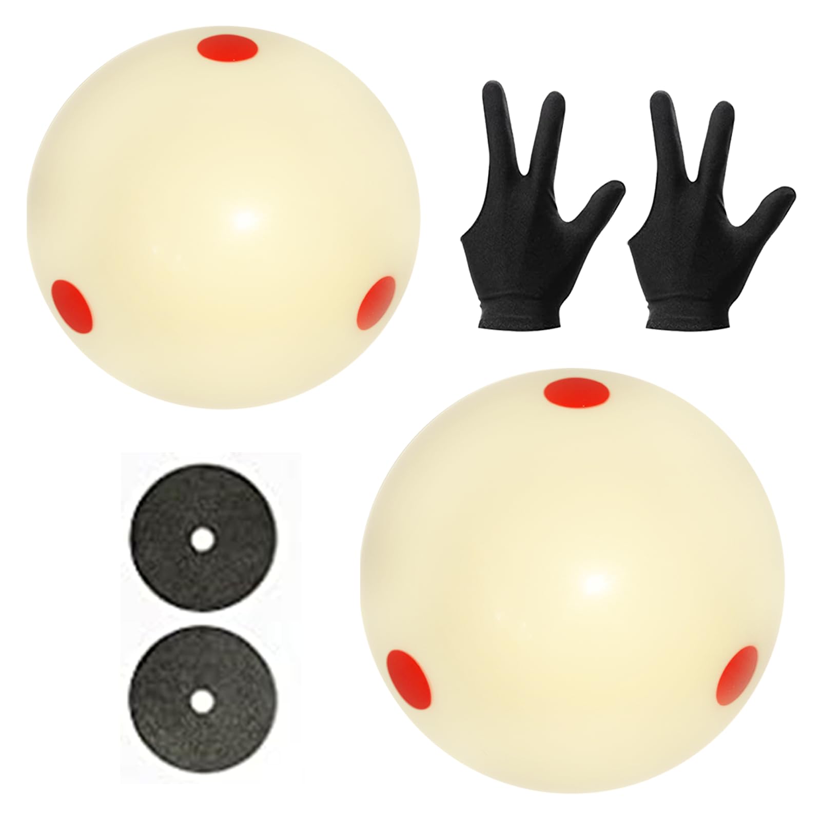 - [You Will Get] Box included two high quality practice billiard cue balls,one of training cue ball,the other was a red dot billiard cue ball,one pair of breathable fingerless gloves and 2 pcs locator sticker.we provide two different levels of practice cue balls to meet your hitting needs. It is also a great gift for your friends