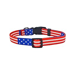 🐕1.【Package includes】-[1 x Dog Collar] 🐕2.【Pretty Pattern Design】Very Stylish American Flag Pattern on double sides, with Black Coated Metal D Ring, looks super high-grade. 🐕3.【Excellent Quality】Made of high quality Polyester Webbing and Black Coated Metal accessories.Straight and firm stitching, excellent workmanship,steady buckle, easy to put on and off,easy wash,easy dry. 🐕4.【4 Sizes for Option】This ASIN is for M/Medium Size: Width 3/4"* Adjustable Girth 13"-20". 🐕5【Warm tips】Please measure your dog girth and add 1/2" to choose the proper size.The Collar is washable but it’s better put them in a washing bag to protect the machine.Don’t let the dog to bite the webbing, afterall it's textile.