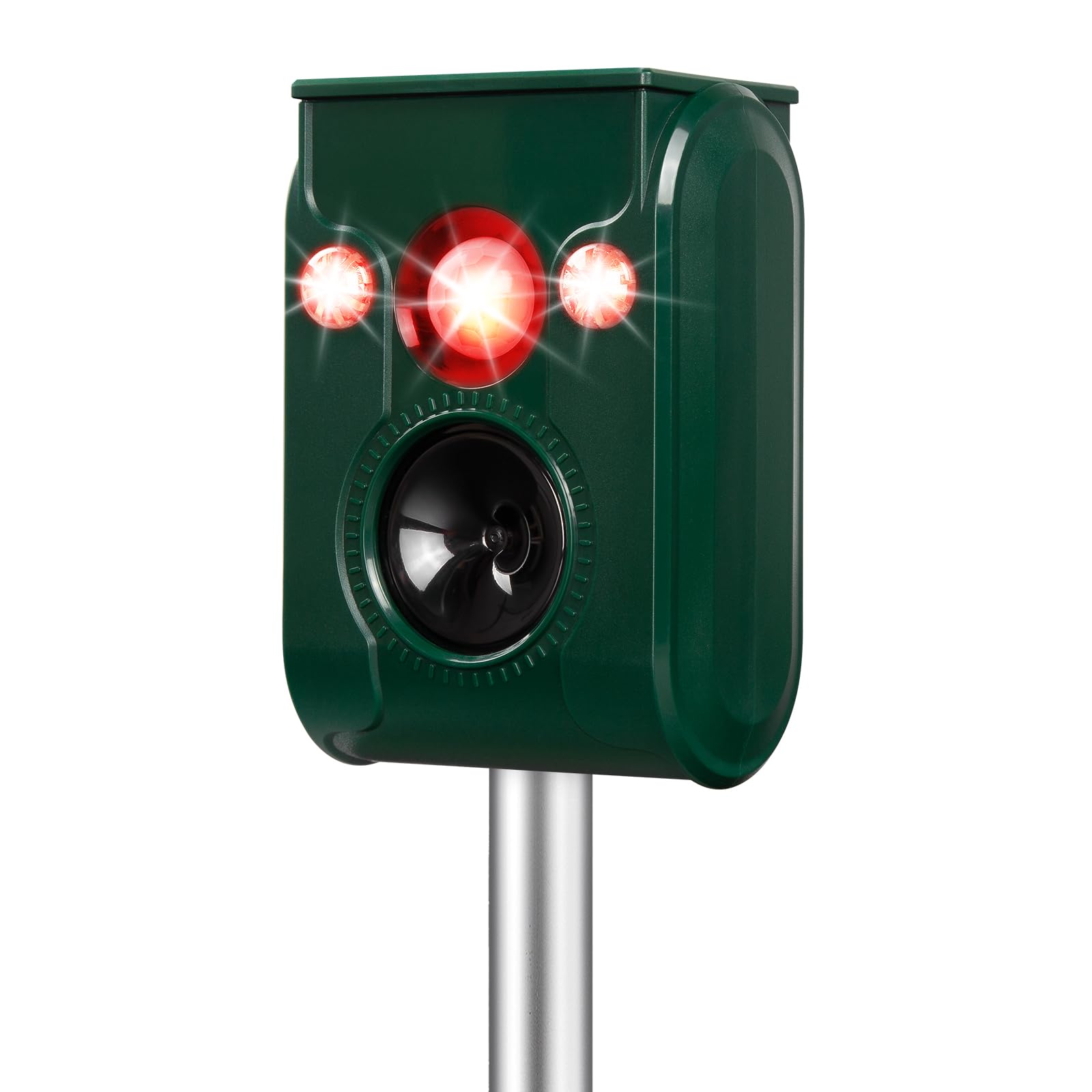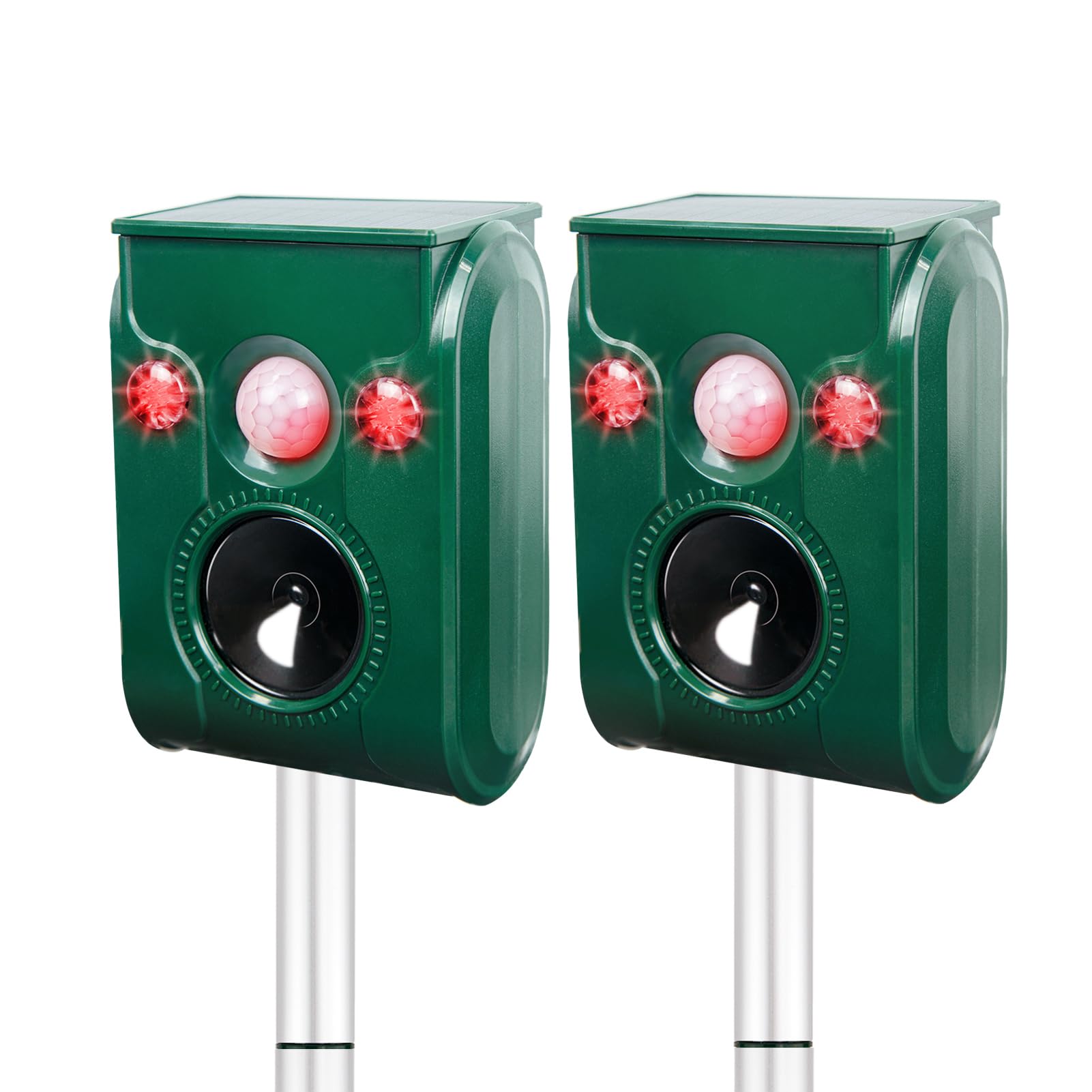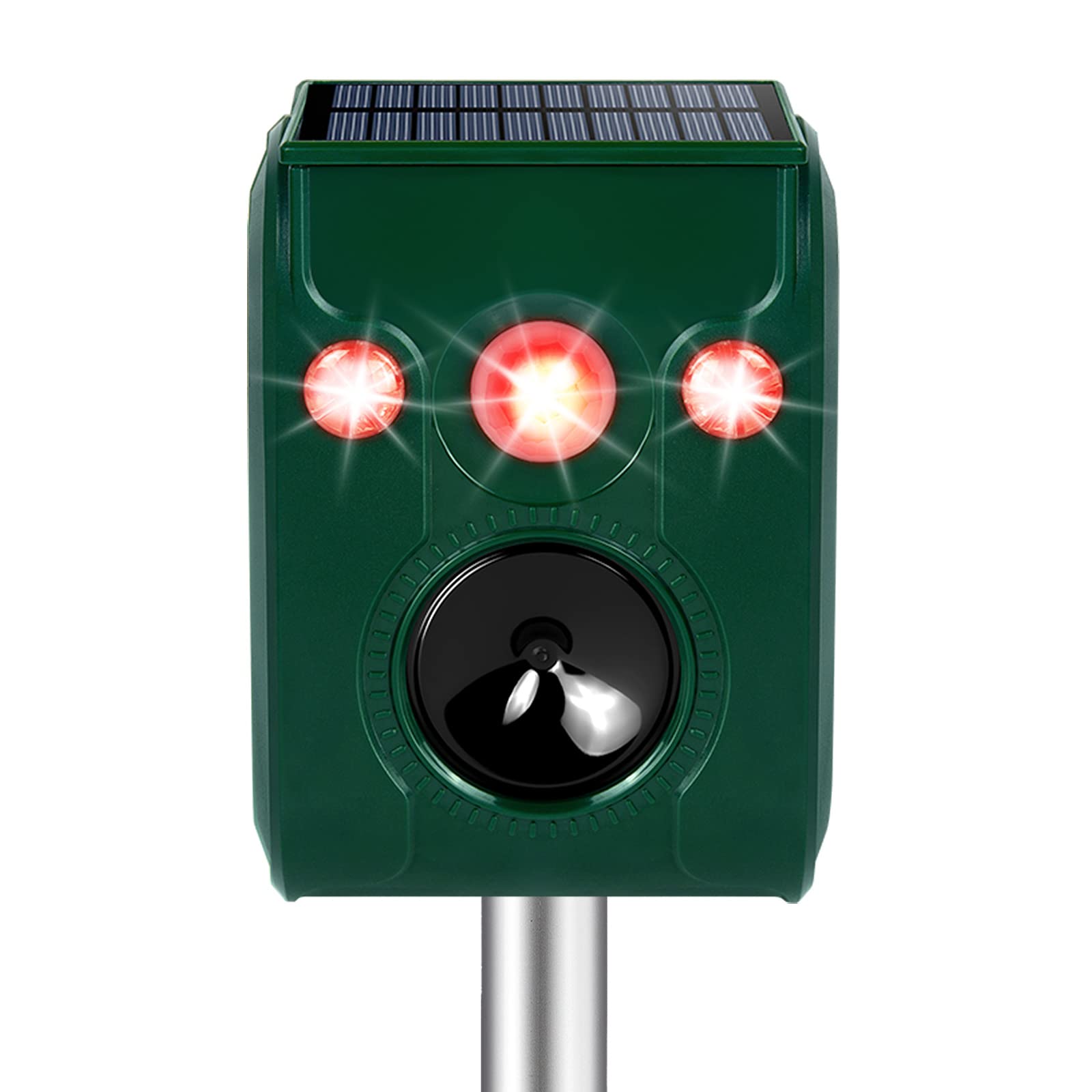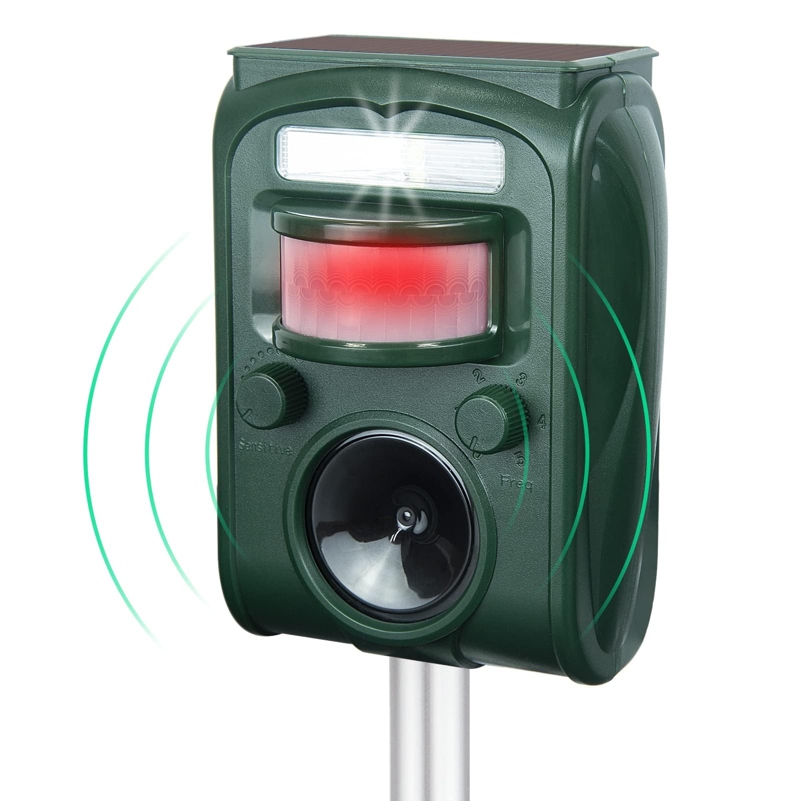 - Multipurpose insect repellent. Disperses animals and pests with ultrasonic waves and powerful LED strobe lights with siren sound. Please set several at multiple angles and orientations. It more efficiently removes cats, dogs, rabbits, birds, bats, boars, deer, mice, squirrels, raccoons and other animals from your house, garden and orchard farm.