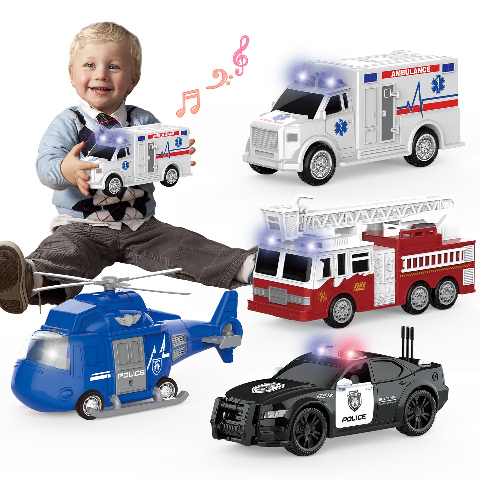 COVTOY 4 Pack Emergency Vehicles with Lights & Siren Sounds - Fire Truck, Ambulance, Police Car & Helicopter - Friction Powered Toys for Boys 3-6