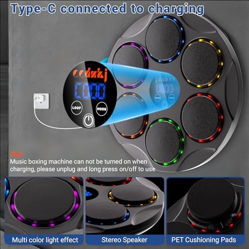 - MÁQUINA DE BOXEO MUSICAL INTELIGENTE:Control de pantalla táctil del volumen, velocidad de golpeo, modos de visualización LED y modos de conteo. Viene con altavoces envolventes, música incorporada y efectos de sonido de percusión, también se puede conectar a la música del teléfono móvil a través de Bluetooth. Las luces LED coloridas guían el objetivo de triking, velocidad y ritmo de iluminación inteligentes. El chip registra automáticamente 999 veces de golpes fallidos y exitosos. Si no hay golpeo objetivo dentro de 5 minutos, se apagará automáticamente y se apagará