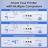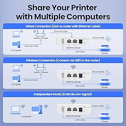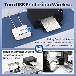 【WIRELESS PRINTING & SHARING】 Convert your old USB printer into a high-performance network printer without messy cables. Our wireless print server allows multiple computers on the same LAN to share one printer simultaneously, enabling automatic queue printing to boost productivity. Access print server efficiently via its assigned IP address from any corner of your office or home. 【DUAL-PORT WIRED BRIDGE & SWITCH】 Featuring two 10/100Mbps Ethernet ports, our server supports a "daisy-chain" setup: connect one port to your network and the other directly to your computer. It acts as a mini-switch to save a router socket and keep your desk organized. NOTE: The second port provides internet to your PC ONLY in wired mode; it does NOT support wireless-to-ethernet bridging. 【UNIVERSAL COMPATIBILITY】 Supports 95% of USB printers, including Inkjet, Laser, Thermal Label, and Dot Matrix models using RAW/IPP protocols. Compatible with major brands like HP, Brother, and Canon. IMPORTANT: Not compatible with dye-sublimation printers (e.g., DNP), Roland BN series, or Canon LBP CAPT series printers. Mobile printing and AirPrint are not supported. 【STABLE DUAL CONNECTIVITY】 Features both 2.4GHz WiFi (802.11b/g/n) and a 10/100Mbps Ethernet port for flexible placement anywhere in your home or office. Equipped with a high-performance processor and smart indicator lights for real-time status monitoring and fast data processing. 【FLEXIBLE & EASY SETUP】 Use our Windows Quick Installation Tool for a streamlined 2-step setup: network config and printer addition. For advanced users or Mac/Linux, we fully support manual configuration via web-based management and standard TCP/IP port settings (IP/Hostname.local). Detailed manuals and video tutorials are provided for a hassle-free experience.