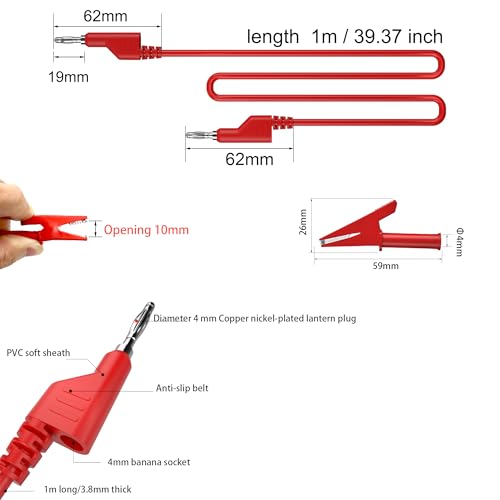 Specifications Color:2 Kinds of Color, Black,Red Material:Nickel plated Copper and Soft PVC insulation plastic covered. Voltage/Current: 30V-ac、60V-dc ;Maximum Current:19A Packing Listing: 2x Stackable Banana to Banana Plug Test Lead(2 Kinds of Color, Black,Red,One for each color) 4 x Nickel plated Copper Alligator Clips(2 Kinds of Color, Black,Red,Two per color) 1 x Storage Box