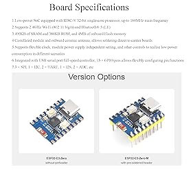 - ESP32-C3 Mini Development Board, Based on ESP32-C3FN4 Single-core Processor, 160MHz Running Frequency, 2.4GHz W-i-F-i & Blue-too-th 5 Board specifications Low-power SoC equipped with RISC-V 32-bit single-core processor, up to 160MHz main frequency Supports 2.4GHz W-i-F-i (802.11 b/g/n) and Blue-too-th 5 (LE) 400KB of SRAM and 384KB ROM, and 4MB of onboard Flash memory Castellated module and onboard ceramic antenna, allows soldering direct to carrier boards Supports flexible clock, module power supply independent setting, and other controls to realize low power consumption in different scenarios Integrated with USB serial port full-speed controller, 15 × GPIO pins allows flexibly configuring pin functions 3 × SPI, 1 × I2C, 2 × UART, 1 × I2S, 2 × ADC, etc. Support C/C++, MicroPython: Comprehensive SDK, Dev Resources, Tutorials To Help You Easily Get Started Package Content ESP32-C3-Zero x2 Online Development Resource/User Manual is provided,, please send us message to get it if neccessary.