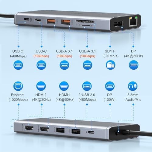 - Docking Station 14 in 1:This usb c docking station could extend your laptop from one usb c/thunderbolt 3/4/type c port into 14 ports:2 HDMI port(4K),Display Port(4K),100W USB C Power Delivery port,Ethernet(1Gbps), 1 USB C port and 2 USB A 3.1 ports(10Gbps), 1 USB C 2.0 and 2 USB 2.0(480Mbps),SD/Micro SD card reader,and 3.5mm Mic/audio.NOTE: Not all USB-C device is compatible with the hub,the incompatible device cannot use theHDMI orDP of this usb c dock