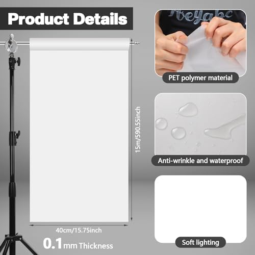 Features: Enhance art effect: : The light diffusing paper features gel material that changes the light characteristics or beam shape, improving the photography effects. Being waterproof, heat-resistant, and flexible, these gel sheets have a long service life and offer a truly immersive photography experience. Ideal gifts for photography enthusiasts: You can display choose this diffusion film sheet to your families or colleagues who love photography, and they will be delighted to receive such practical and thoughtful gifts. Specifications: Material: PET polymer Size: approx. 15.75 x 590.6 Inch/ 0.4 x 15 m Color: white Package includes: 1 x Light diffuser sheet Notes: Manual measurement, please allow slight errors on size. The color may exist a slight difference due to different screen displays