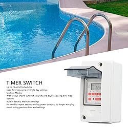 [Versatile Scheduling Options] With up to 28 on off schedules for 7 day cycles or single day settings, featuring options for always on off, automatic on off, and daylight saving time modes to suit your specific needs. [Built in Battery] Built in battery holding settings, this timer switch retains your programmed settings during power outages, eliminating the hassle of resetting and ensuring your schedules remain intact. Box] Constructed with a PC casing that is flame retardant and to , this timer switch is capable of withstanding outdoor conditions. Its two outlet holes prevent water ingress into the wiring box. [Wide Operating Temperature Range] Operating in temperatures ranging from ‑10℃ to +55℃, this timer switch ensures long lasting performance and reliability in outdoor applications. [Versatile Usage] Designed for controlling 1 device, suitable for outdoor indoor high power appliances such as pool pumps, heaters, filters, and other motor driven devices.