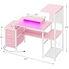 Small Gaming Desk with 2 Fabric Drawers - Reversible Computer Desk with Power Outlet & LED Lights, 49" Office Desk with Monitor Stand & Storage Shelves, Writing Study Table with Pegboard, Pink