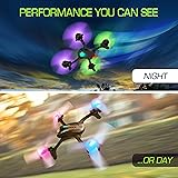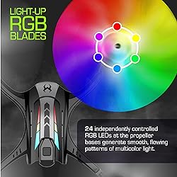 Fly day or night – Performance flight by day, dazzling light displays by night Light-up RGB propellers – 6 independently controlled LEDs per blade (24 total light zones) 25+ light patterns – Select from a mesmerizing array of colors and effects Dynamic light modes - Patterns and colors shift in sync with your maneuvers One-touch stunts – Perform 360º flips in four directions with a single button press Auto launch and land – Smooth takeoffs and pinpoint landings, no flight experience required Flight modes for every skill level – Start steady, then step up to sharper, more aggressive handling Long-range 2.4GHz transmitter – Responsive control, even at extended distances Rechargeable LiPo power – Removable 1200mAh 3.7V battery Also includes USB battery charger, extra replacement propellers and instructions. For teens and adults – Minimum age: 12 years