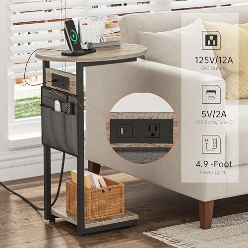 Vagusicc C Shaped End Table with Charging Station, Small Side Table for Couch, Slide Under Sofa Table for Living Room Bedroom, Round Couch Side Table, C Table for Couch Snack Table TV Tray, Greige