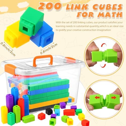 - Math Skills Development: the math cubes can be easily connected together to help kids master early math skills, such as counting, sorting, grouping, addition and subtraction, color identification, etc.; The math cubes bulk include 200 cubes in 10 vibrant colors and a storage container